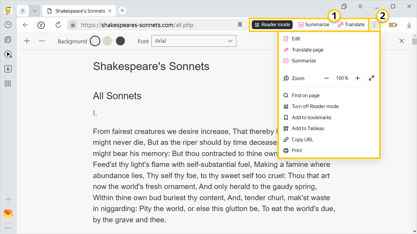 Open the page menu. Click this icon to see the full list of actions available for the page. For example, read or translate the page, bookmark it, or add it to the Tableau. You can't turn it off.