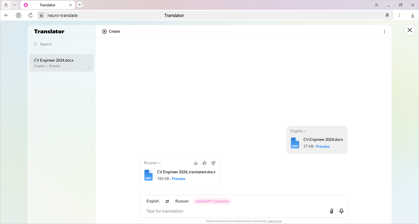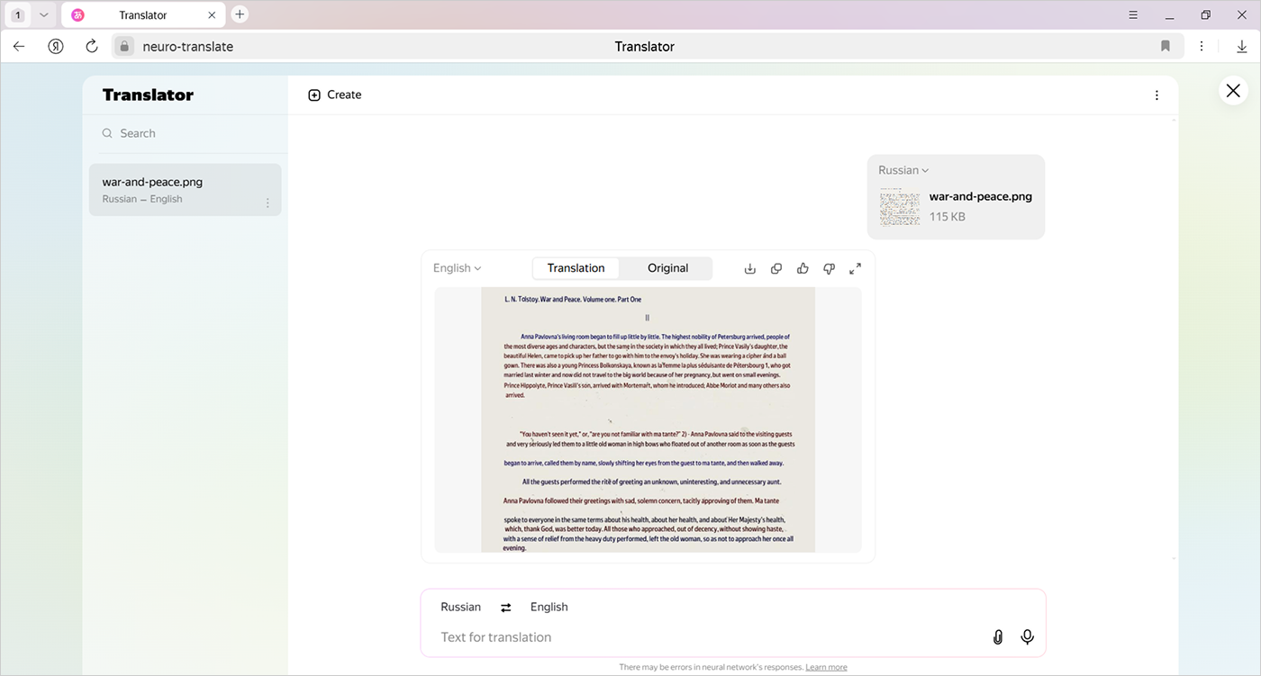 It works in a chat format: you send a request to translate some text, image, site, or document, and get a translation in response.