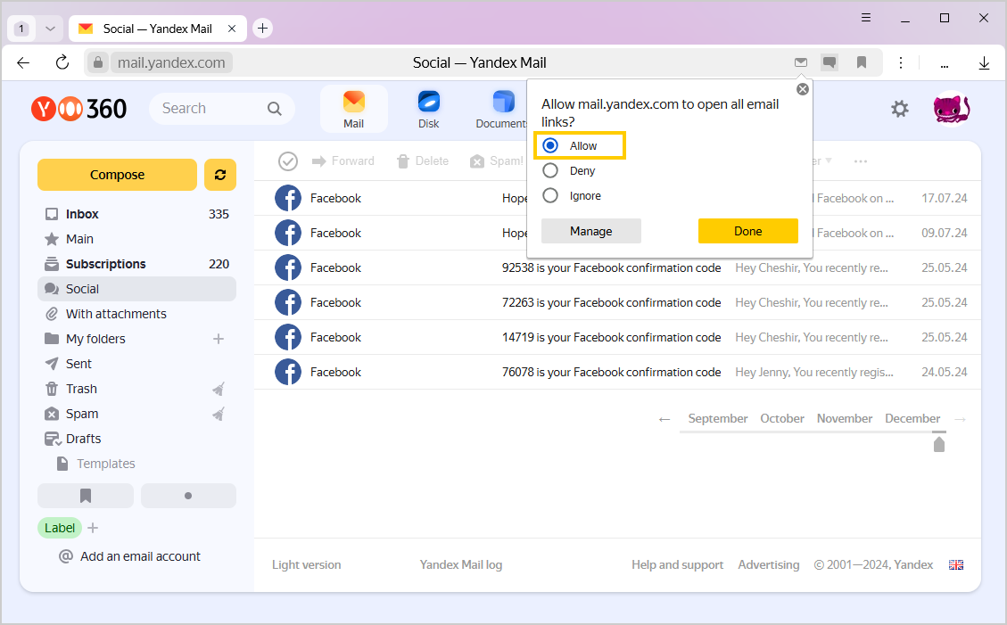 When you open Yandex Mail in Yandex Browser for the first time, it offers to make it your default protocol handler: