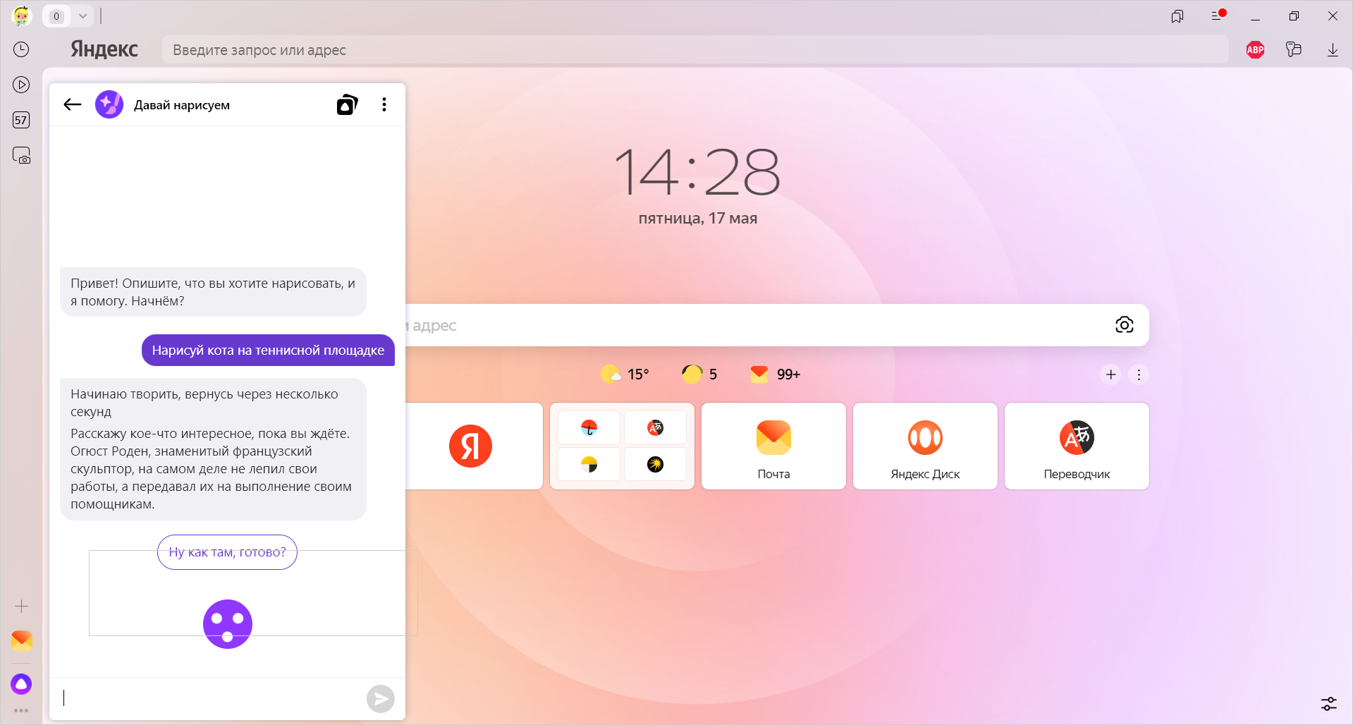 YandexART нейрожүйесі, мысалы, әлеуметтік желілердегі пост немесе презентация үшін тікелей Браузерде сурет жасауға көмектеседі. Сурет жасау үшін: