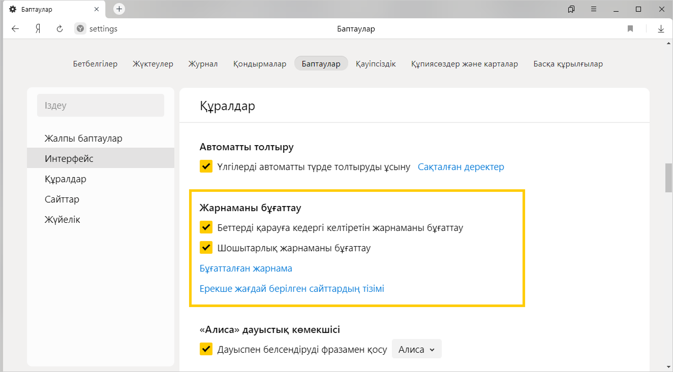 Яндекс Браузер кедергі келтіретін жарнама форматтарын сүзгіден өткізеді, сіз оларды баптаулар опциясында өшіре аласыз.