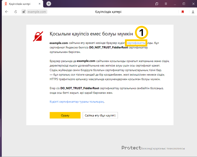 Сіз «Сіз қауіпсіздік сертификатына сенуге болмайтын example.com сайтына кірдіңіз хабарламасып көресіз. Сертификат белгісіз Яндекс сертификаттау орталығымен берілді, алайда операциялық жүйе оны сенімді деп санайды...».