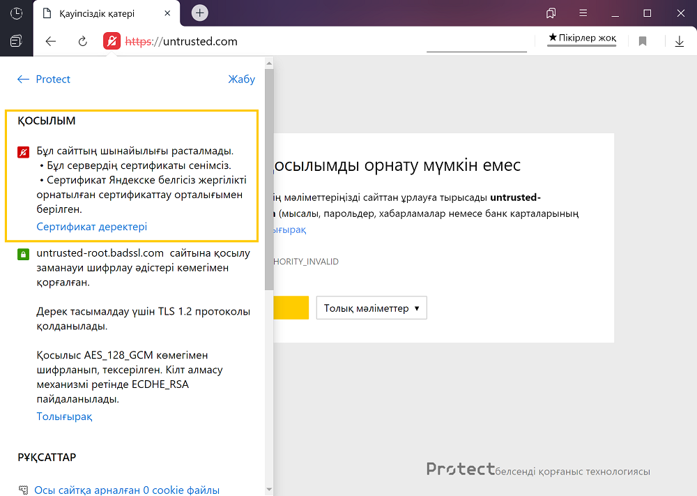 Protect кешенді қорғауы шеңберінде Браузер сайт сертификаттарын тексереді. Егер сертификатқа қатысты мәселелерге байланысты сайт сіздің деректеріңізді қауіпсіз шифрлауды қамтамасыз ете алмаса, Яндекс Браузер бұл туралы ескертеді.