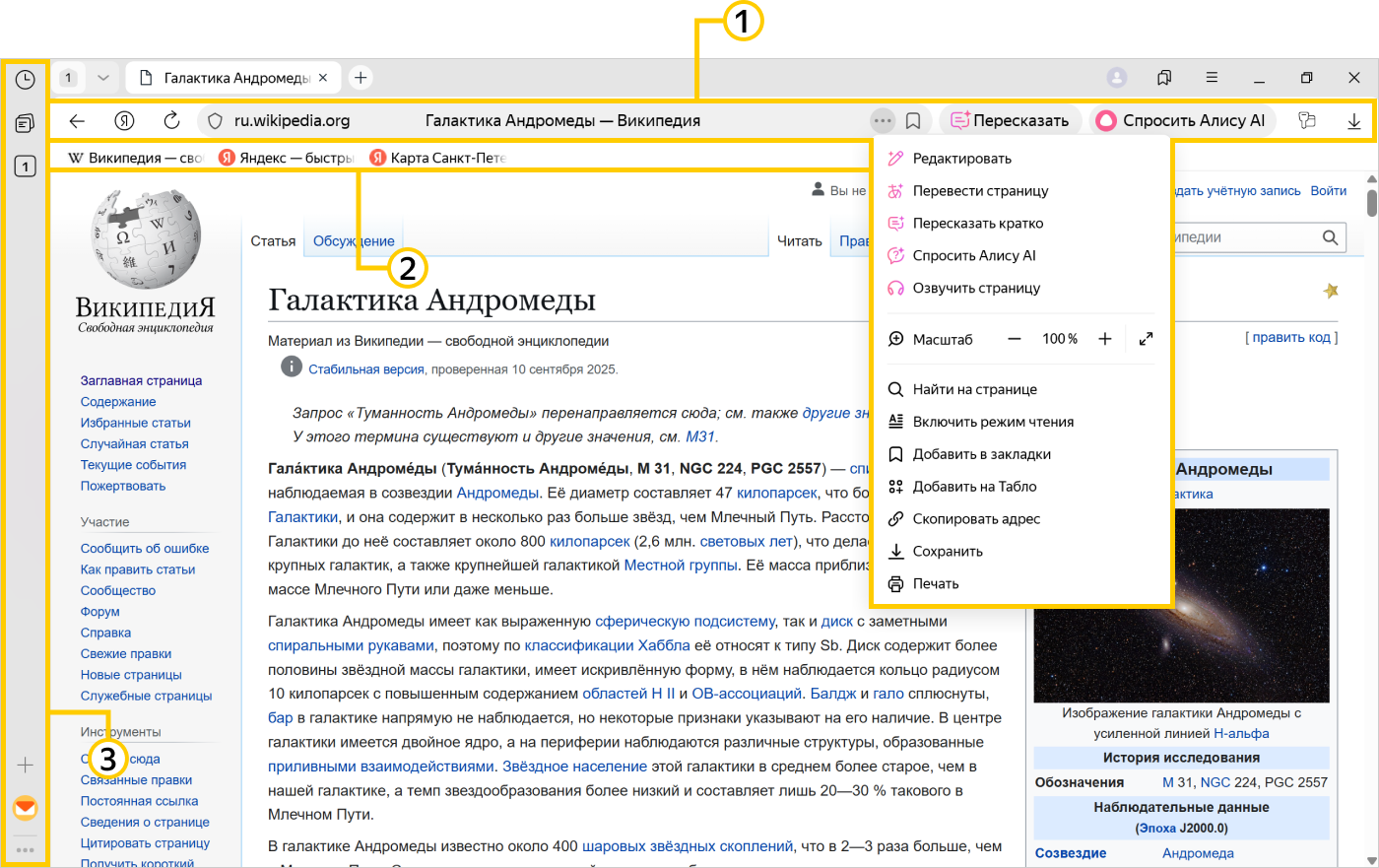 В поисковой строке введите адрес сайта или запрос. После ввода текста используйте стрелки или Tab, чтобы переключаться между поисковыми подсказками. Вы также можете перемещаться между кнопками Копировать, Добавить страницу в Закладки