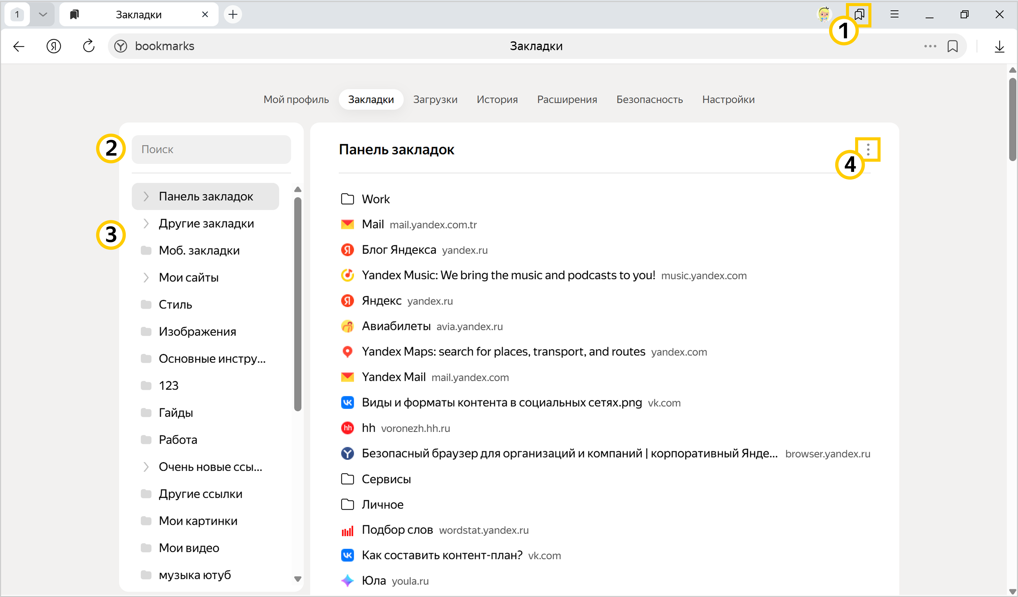 4 — меню панели закладок.