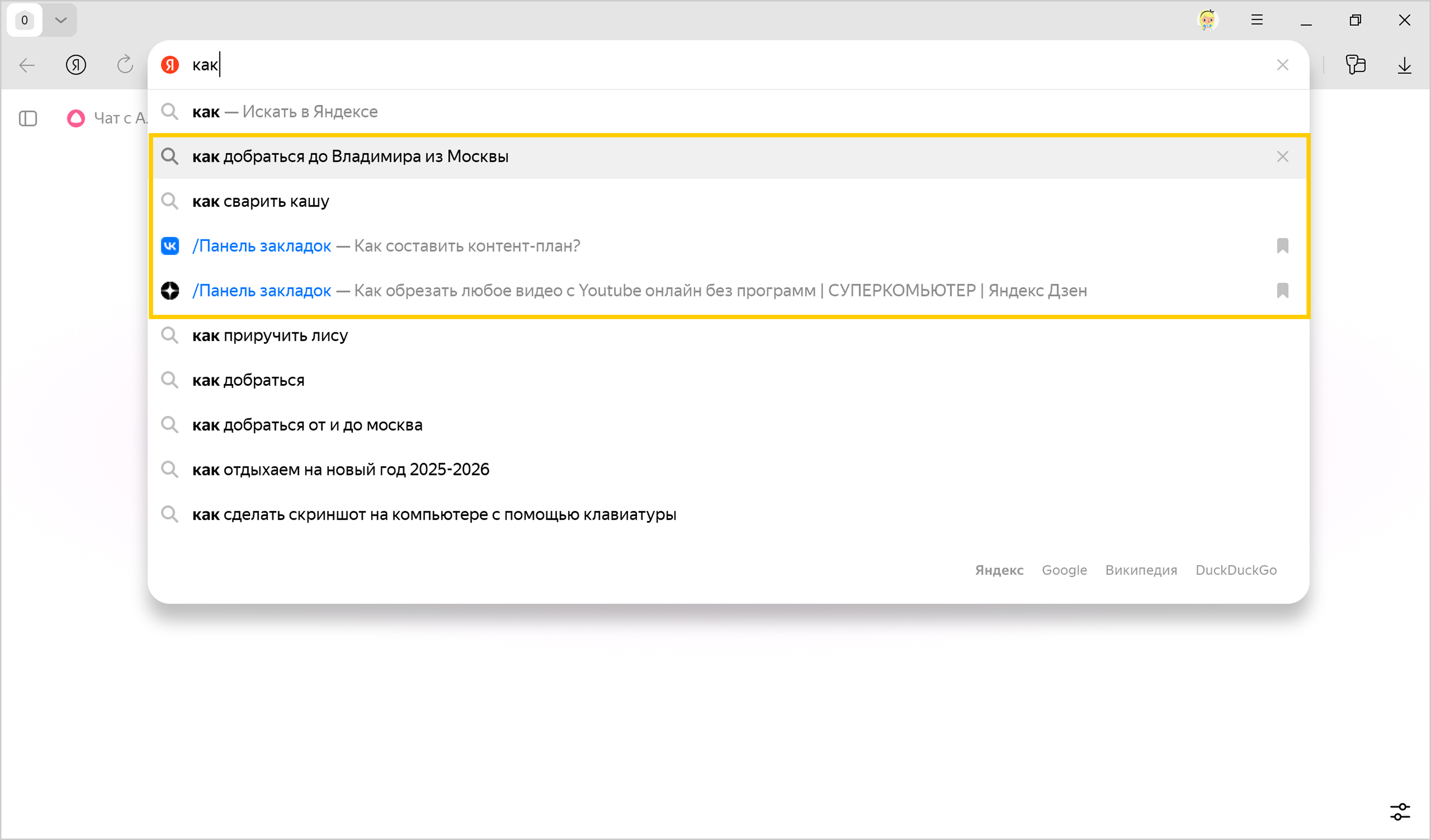 В адресную строку можно вводить поисковые запросы — Браузер сам поймет, что вам нужно.