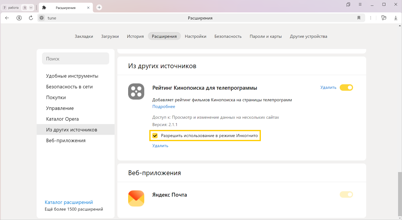 Включите опцию Разрешить использование в режиме Инкогнито.