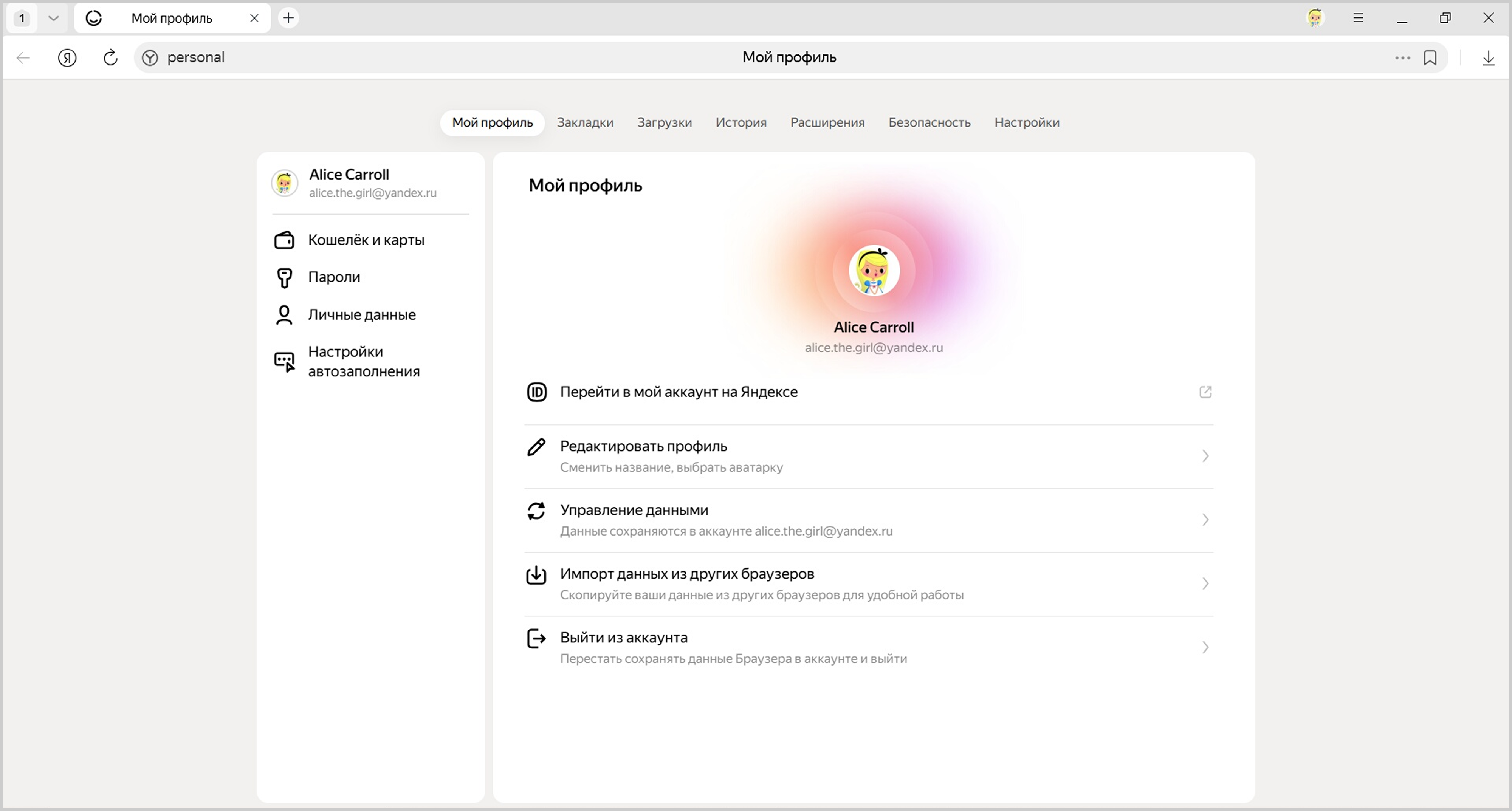 Мой профиль — это рабочее пространство в интернете, в котором хранятся все ваши настройки, история работы с сайтами, закладки и открытые вкладки, а также cookie, входы на сайты и способы оплаты.