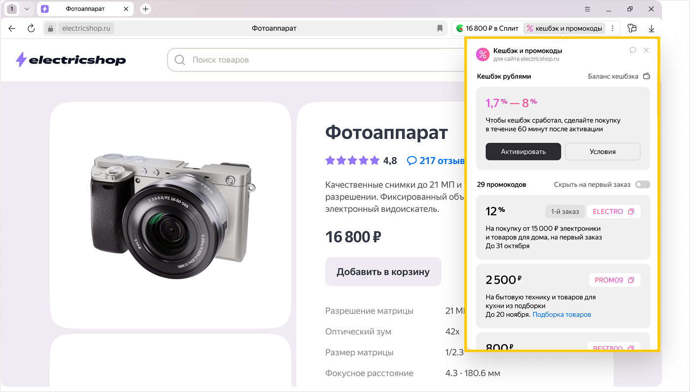Яндекс Браузер помогает экономить при покупках на сайтах интернет-магазинов — получать кешбэк с покупок и находить доступные промокоды.