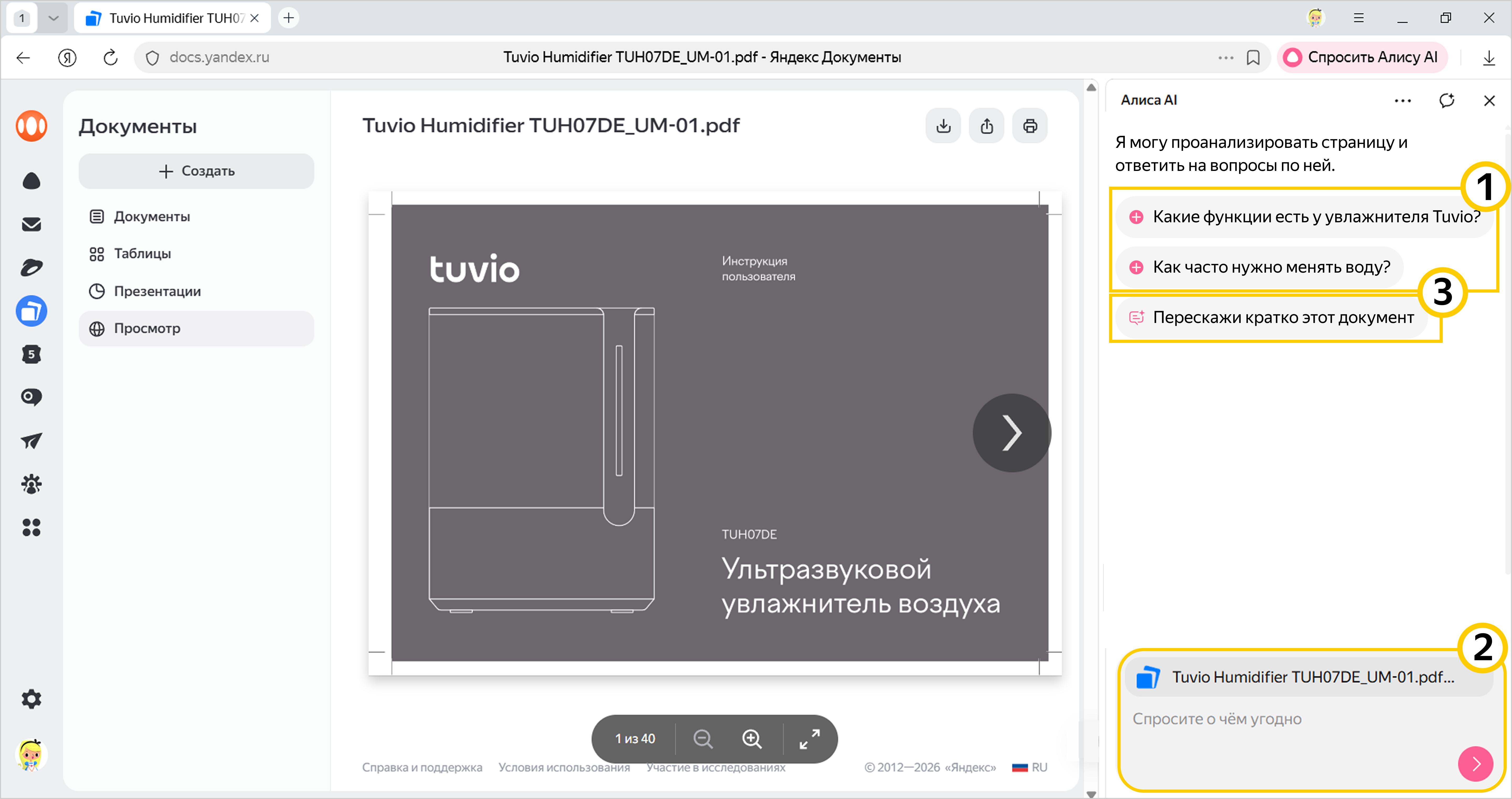 1 Нажмите на один из предложенных Алисой AI вопросов – они подготовлены с учетом контекста документа.