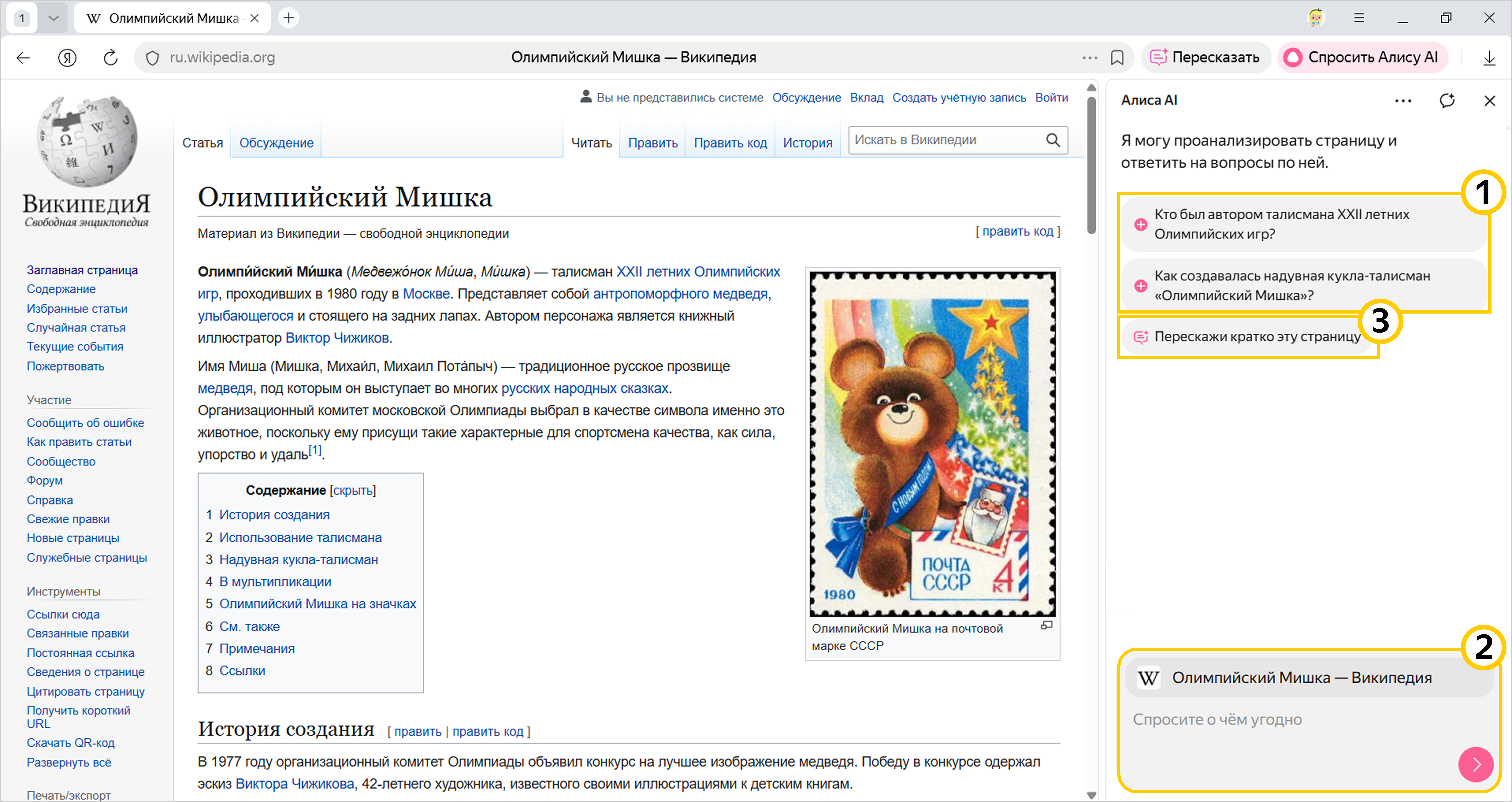 1 Нажмите на один из предложенных Алисой AI вопросов — они подготовлены с учетом контекста страницы.