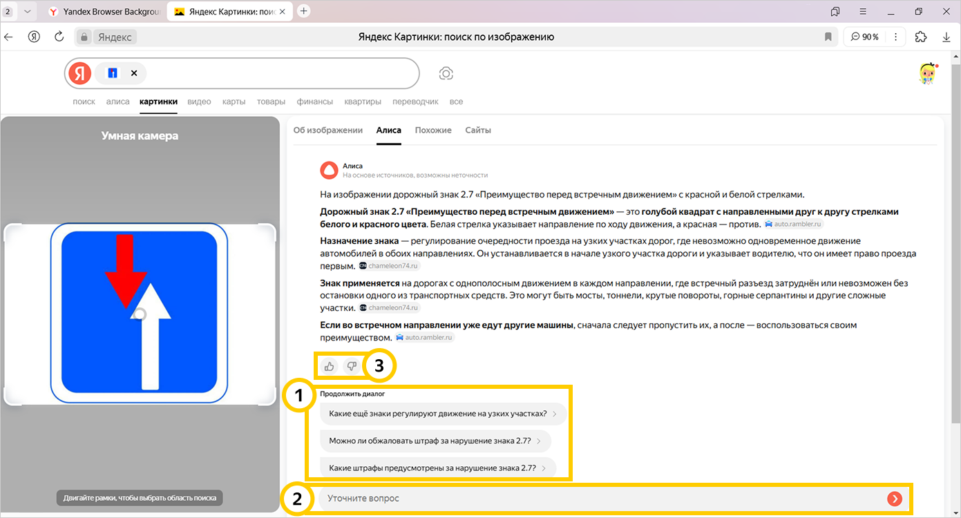 Умная камера — это камера в Яндекс Браузере, которая узнает предметы, рассказывает, что видит, и советует, где купить. Она может распознать текст, перевести надписи, отсканировать документы и т. д. На компьютере Алиса с помощью Умной камеры подскажет, что изображено на картинке и что с этим можно сделать. Загрузите фото неизвестного фрукта, непонятного значка (например, на одежде) или растения с болезнью — Алиса проанализирует изображение и подскажет, что это и как действовать.