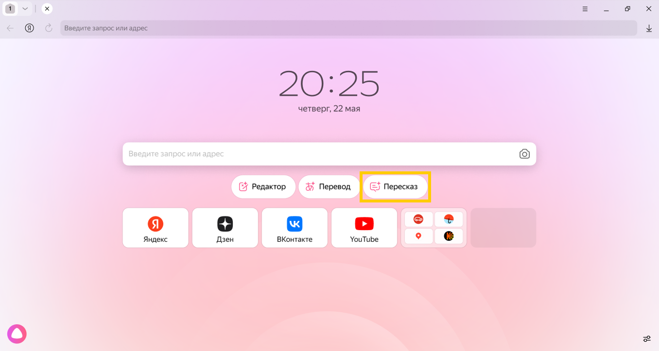 Под Умной строкой выберите Пересказ. Он запустится в режиме вкладки.