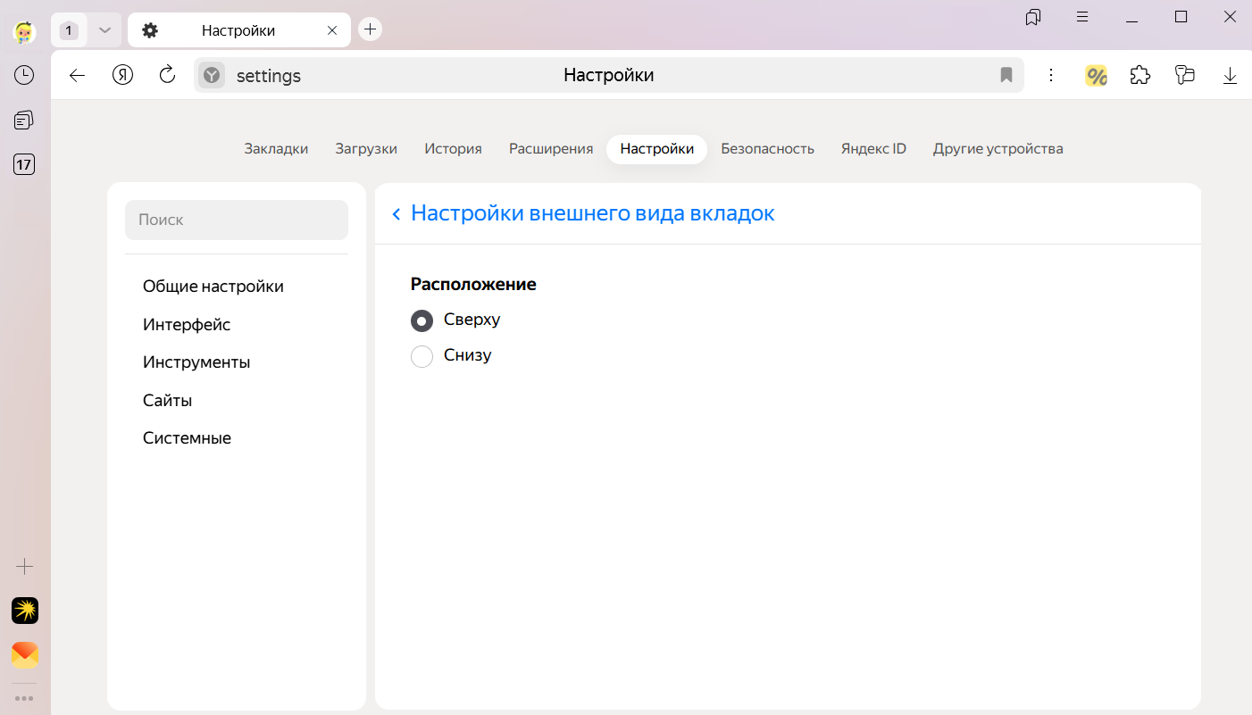 После этого вкладки переедут вниз. Чтобы переместить вкладки наверх, включите в настройках в разделе Настройки внешнего вида вкладок опцию Сверху.
