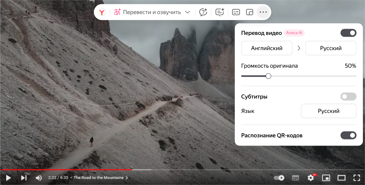 Также при переводе видео с английского языка Браузер умеет передавать интонации и голоса говорящих, используя технологию живые голоса. Так перевод звучит более естественно и человечно.