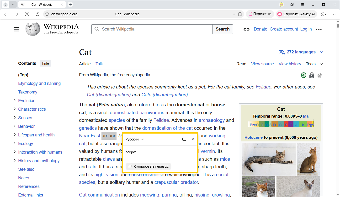 Браузер может переводить на русский язык отдельные слова или предложения на странице. Чтобы увидеть перевод слова или словосочетания, выделите их и нажмите Перевести в контекстном меню. На странице появится окно с переводом.