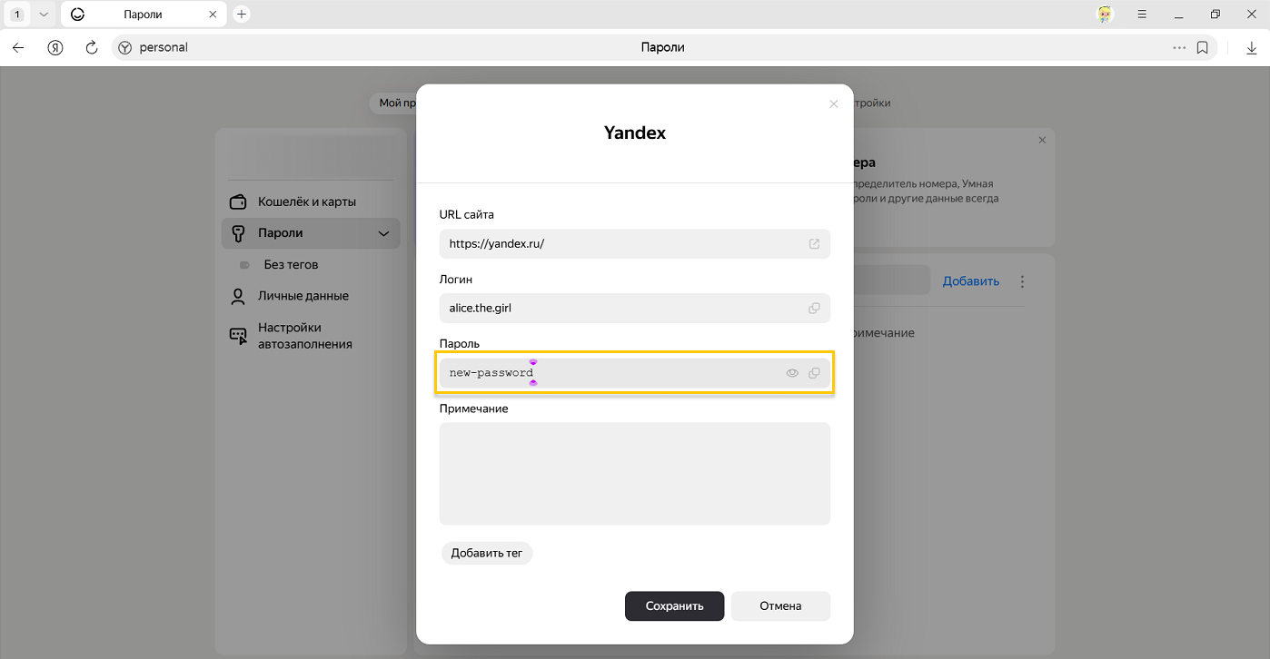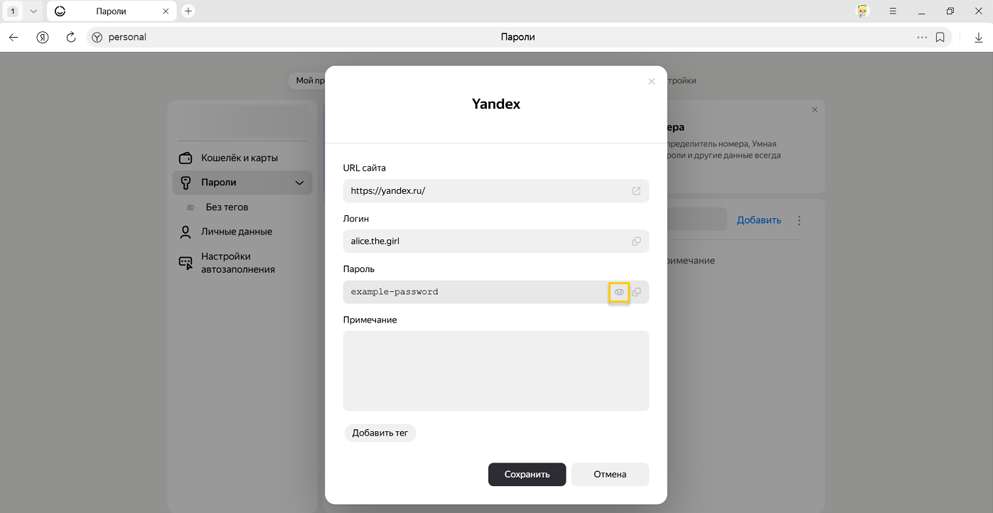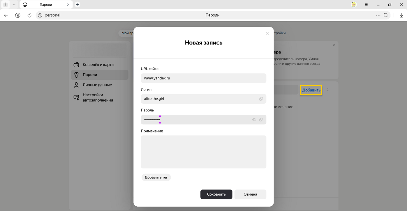 Аналогичным образом можно сохранить в менеджере паролей СНИЛС, номер паспорта и другую конфиденциальную информацию. Если у вас включено сохранение карт, то данные будут доступны со всех ваших устройств. За безопасность данных можно не беспокоиться — они хранятся в зашифрованном виде. Подробнее см. статью «Как зашифровать любую важную информацию в Браузере».