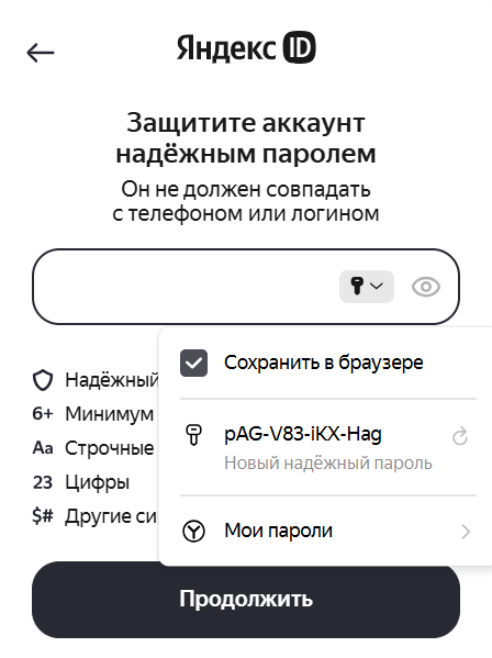 1. Установите курсор мыши в поле ввода пароля. Браузер автоматически предложит сгенерированный пароль.