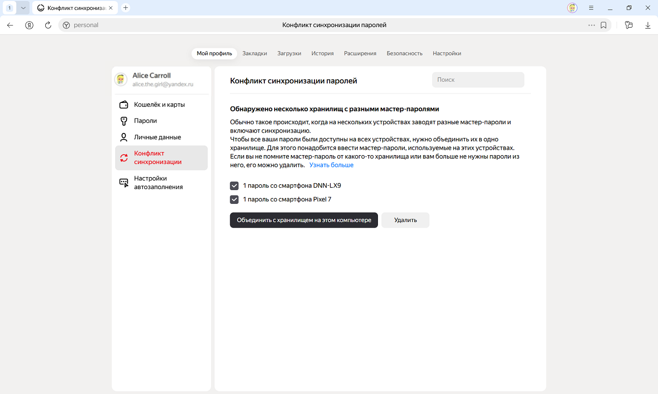 Если вы меняете мастер-пароль или создаете разные мастер-пароли на устройстве с отключенной опцией передачи паролей, возникнет конфликт. Например, вы ввели один мастер-пароль на смартфоне, который передает пароли, а другой — на компьютере, на котором эта опция отключена. Затем вы включили на компьютере передачу паролей. В этом случае Браузер не может понять, какой из мастер-паролей нужно использовать для шифрования объединенного хранилища.