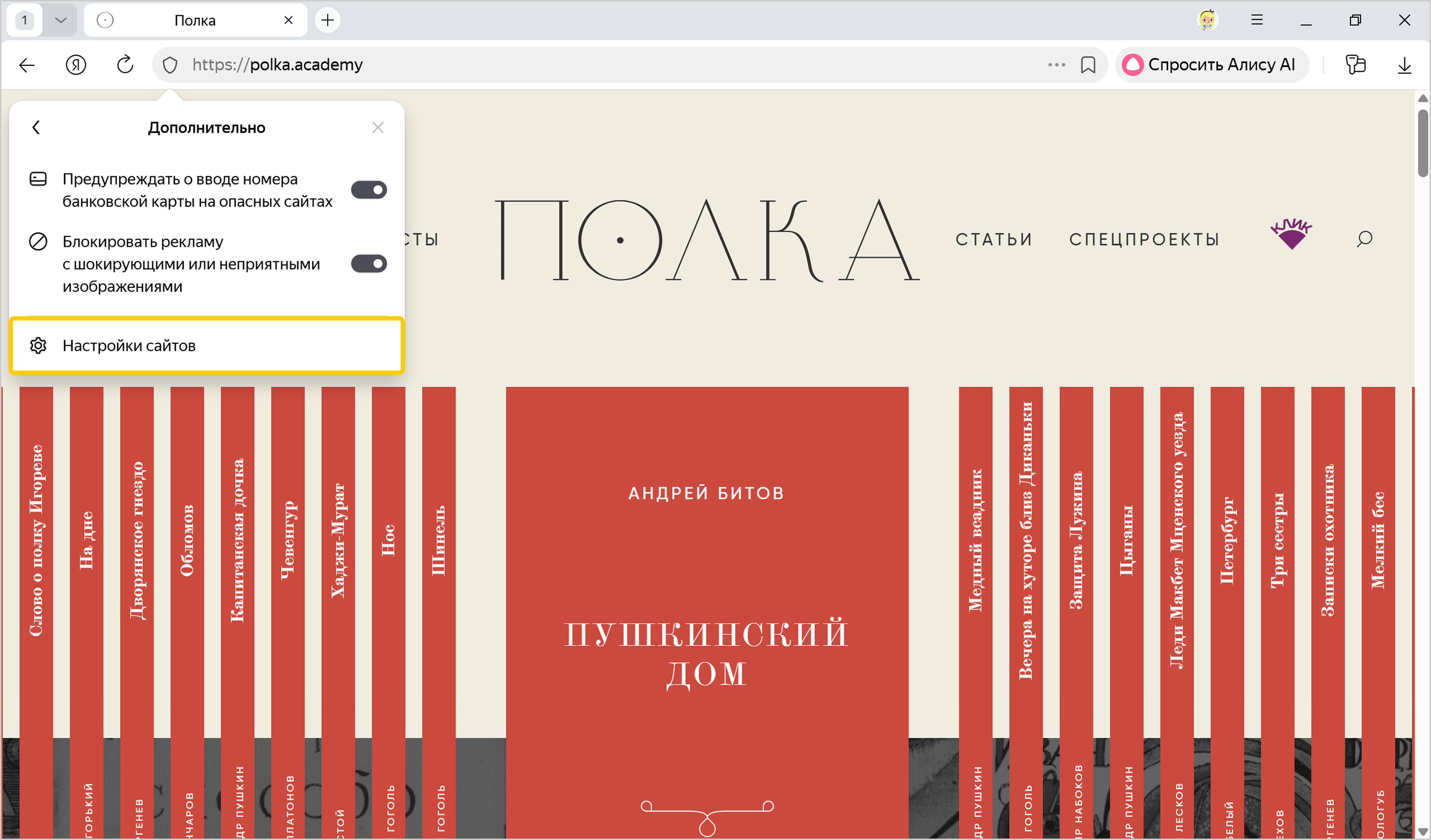 Прокрутите страницу вниз и нажмите Расширенные настройки сайтов.
