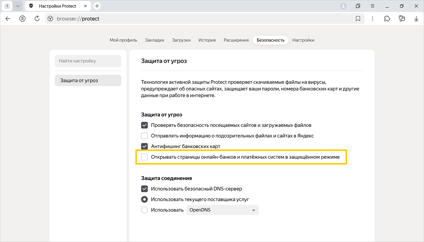 3. В разделе Защита от угроз отключите опцию Открывать страницы онлайн-банков и платёжных систем в защищённом режиме.