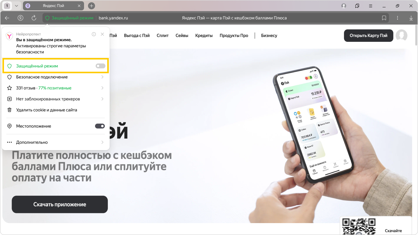 Защищенный режим — это режим, который Яндекс Браузер включает на страницах банков и платежных систем, чтобы сделать электронные платежи более безопасными. В защищенном режиме Браузер включает строгую проверку сертификатов. Если с сертификатом всё в порядке, Браузер отключает расширения и изменяет интерфейс. Защищенный режим является частью комплексной системы защиты Нейропротект.
