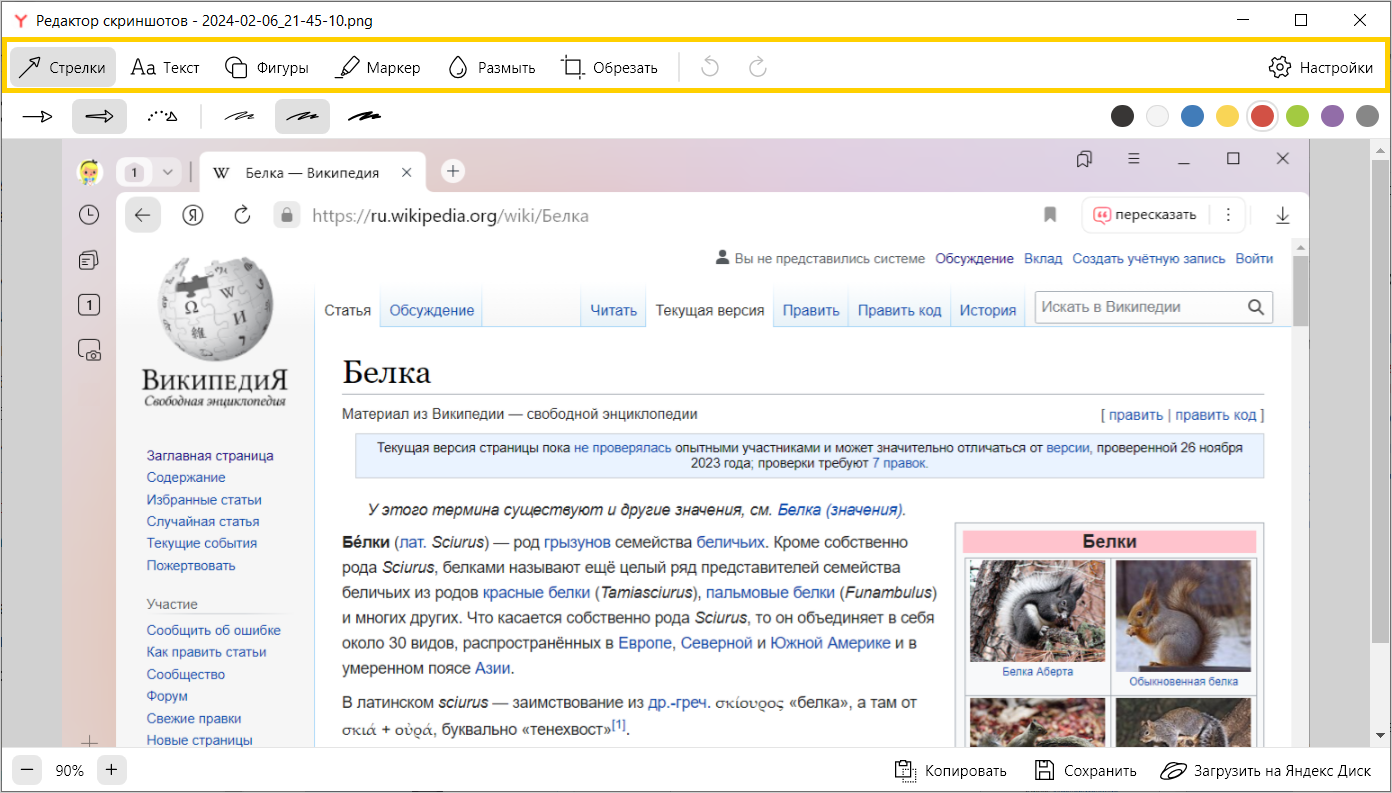 Вы можете обрезать сделанный скриншот, нарисовать на нем фигуры или стрелки, пометить маркером, добавить текстовые надписи, размыть часть изображения.