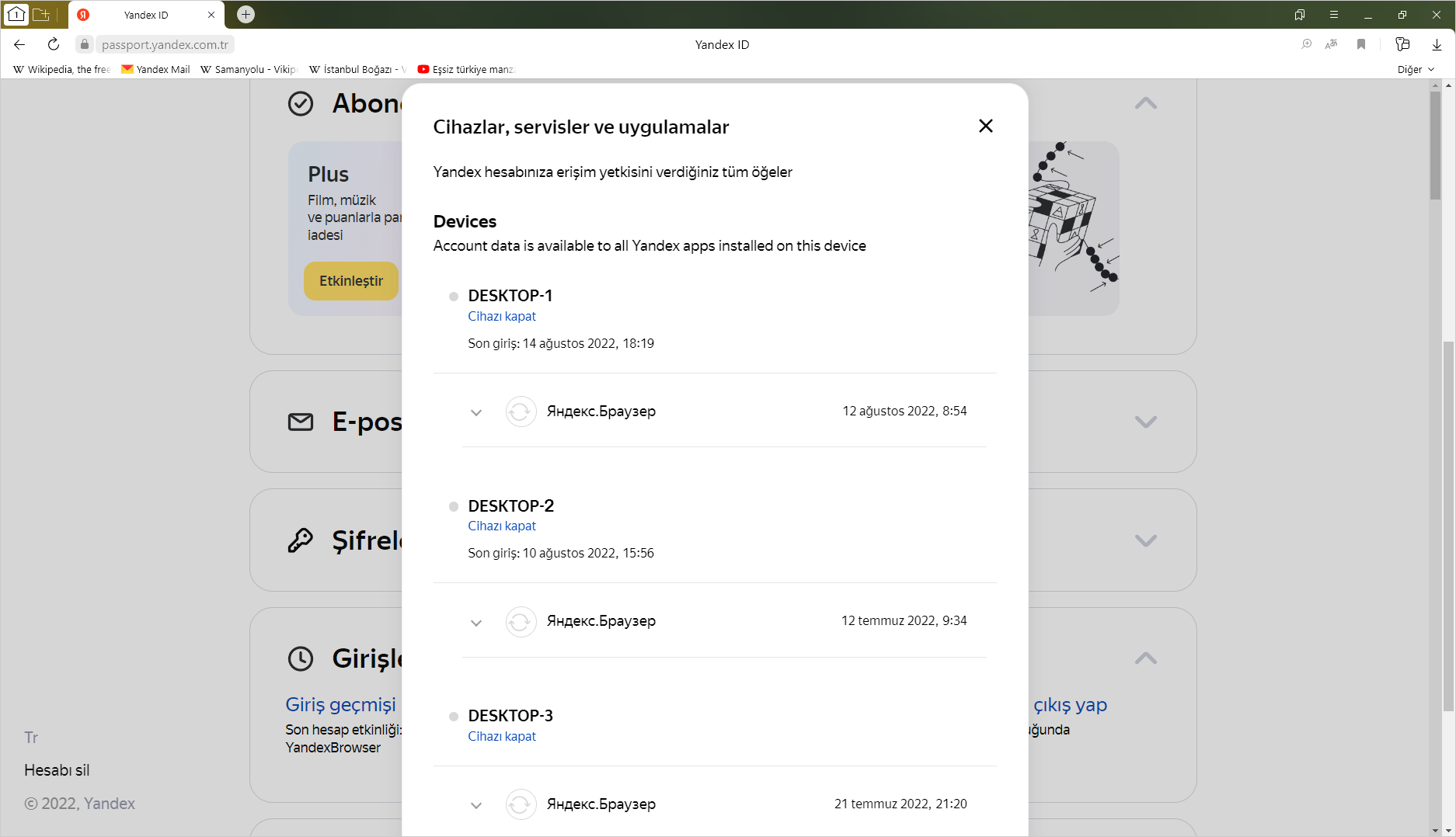 Son giriş alanındaki tarih ve saati kontrol edin. Erişilemeyen cihazda yer alan Yandex Browser'daki verilerin silinme işlemi eşitlendikten sonra, bu alandaki değerler güncellenir. Eşitleme, internet hızına ve veri miktarına bağlı olarak 40 dakikaya kadar sürebilir.