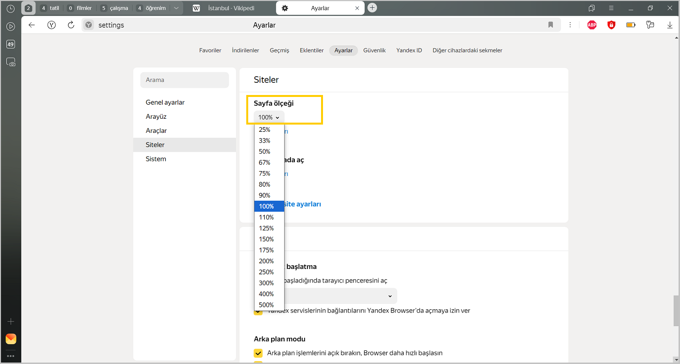 Değiştirilmiş ölçek verileri Yandex Browser'nde kaydedilir. Sayfa tekrar açıldığında seçtiğiniz ölçekte görüntülenecektir.