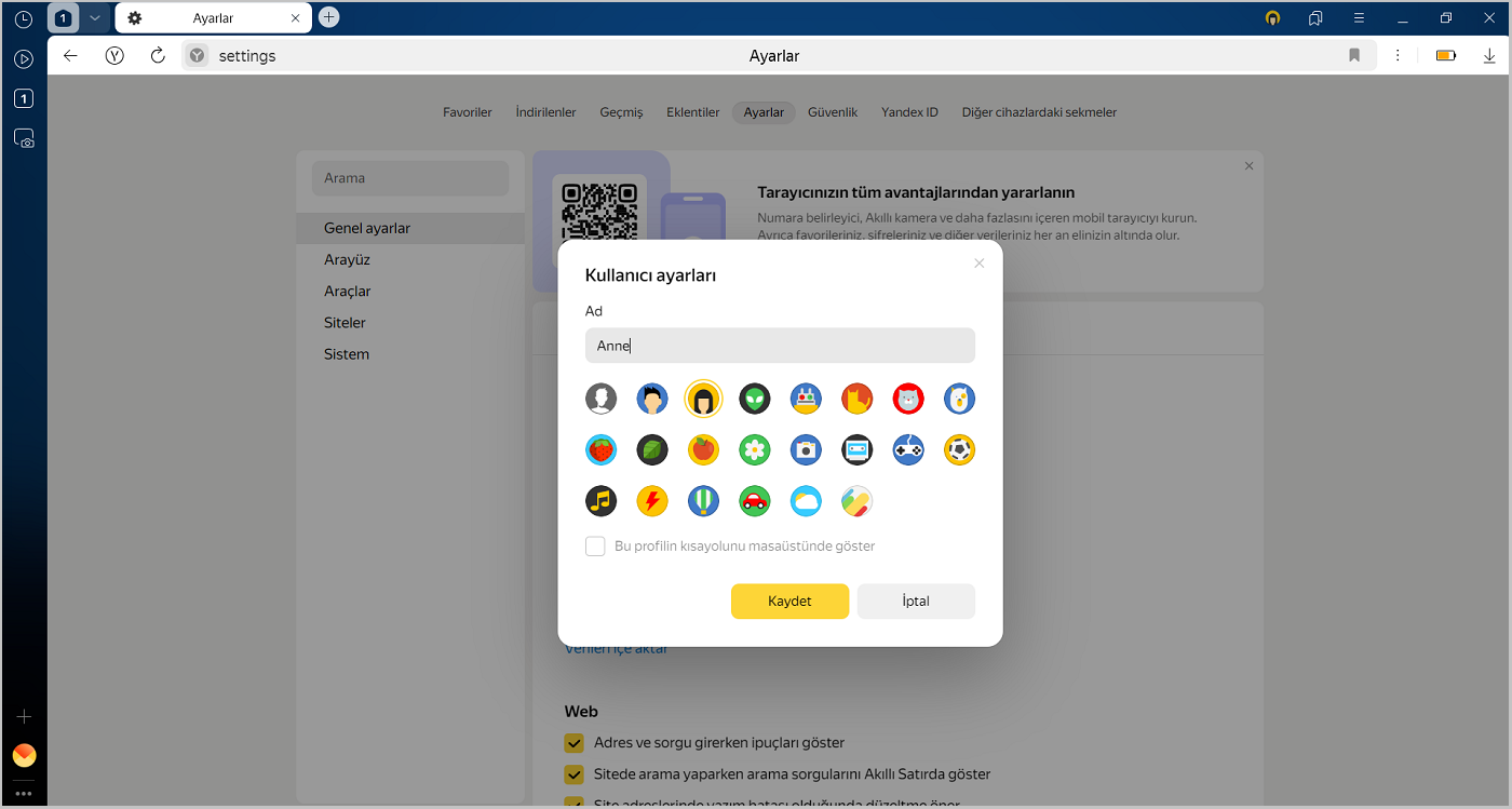 Seçilen profil portresiyle yeni bir Yandex Browser penceresi oluşturulacaktır. Tüm Yandex Browser profilleri ayarlarda görüntülenebilir:
