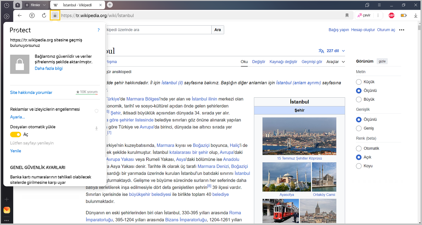 Yandex Browser'ı internette en güvenli şekilde kullanmanız için, kapsamlı koruma sağlayan Protect sistemi kullanılır. Akıllı satır'daki simgeler, Protect'teki bilgilere ve ayarlara hızlı bir şekilde erişmenize yardımcı olur.