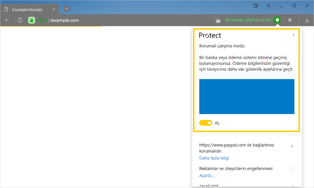 Korumalı çalışma modunun etkin duruma geçmemesi ilgili sitenin güvenlik sertifikasıyla ilgili bir sorun olduğu anlamına gelebilir. Böyle bir sayfada ödeme yapmamanızı öneririz. Bu durumda Protect panelini açmanızı ve kullanılan sertifikanın bilgilerini okuyarak olası riskleri kendiniz değerlendirmenizi öneririz.