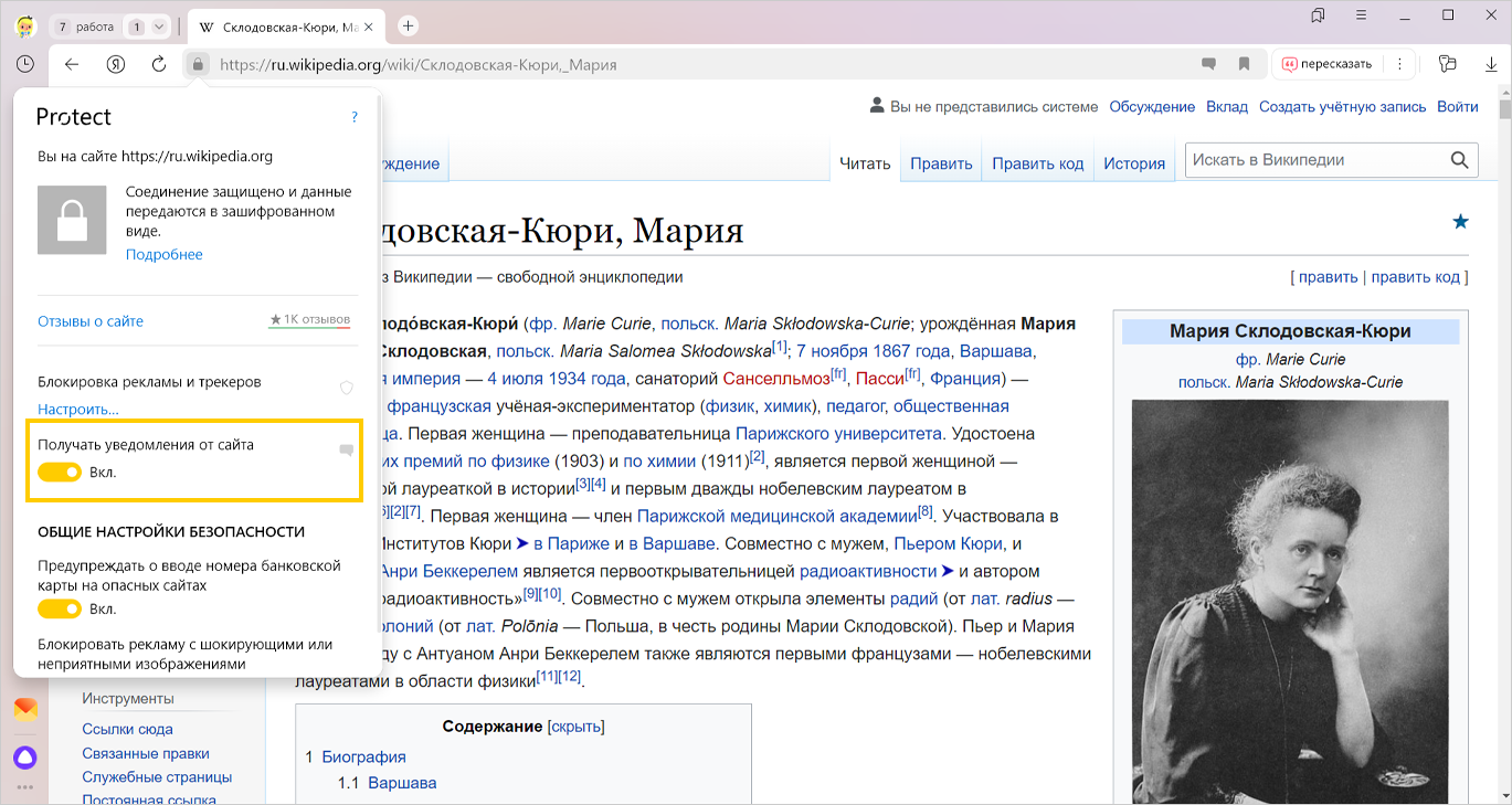 Ochilgan Protect panelida Saytdan bildirishnomalar olish opsiyasini yoqing yoki oʻchiring.