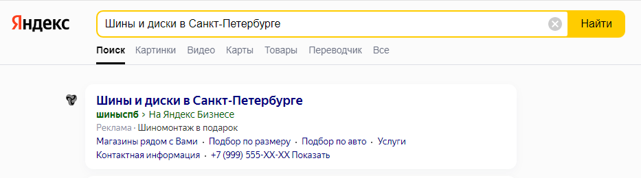 Нажав на рекламное объявление, пользователь перейдет в карточку компании в Картах. Там он может совершить целевое действие: построить маршрут до вашей компании, позвонить вам или перейти к просмотру товаров.