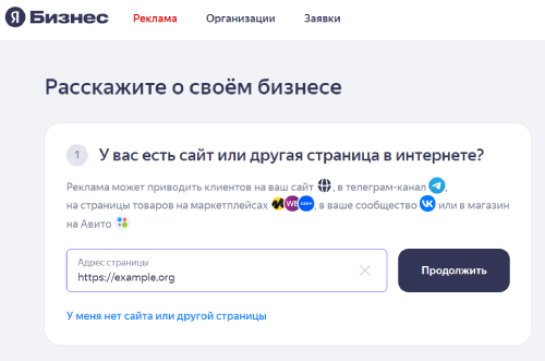При создании новой рекламной кампании укажите адрес своего сайта и нажмите Продолжить.