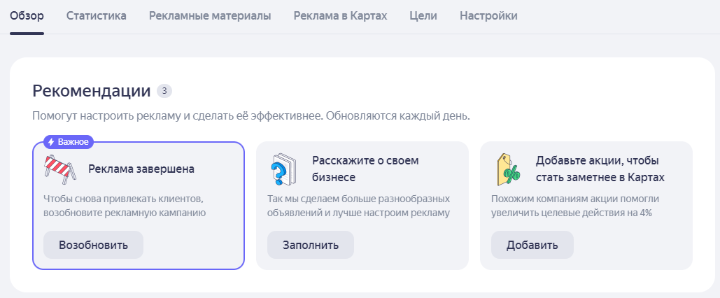 - Здесь мы советуем, как сделать кампанию более эффективной. Например, можем предложить заполнить кампанию материалами, подключить настройки. Также можем напомнить, что нужно продлить кампанию или увеличить бюджет.
