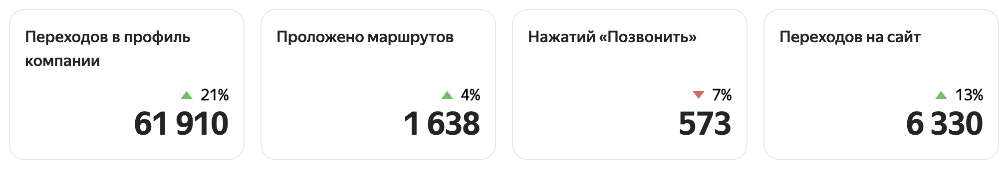 В разделе Статистика → Профиль в Яндексе вы увидите данные по всему трафику и кликам профиля компании в Картах, Поиске, Услугах и Кью.
