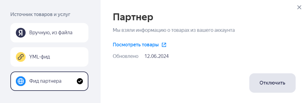 В Личном кабинете Яндекс Бизнеса в разделе Товары и услуги в меню Источник товаров и услуг. Подробнее см. Как загрузить прайс‑лист из другого источника.