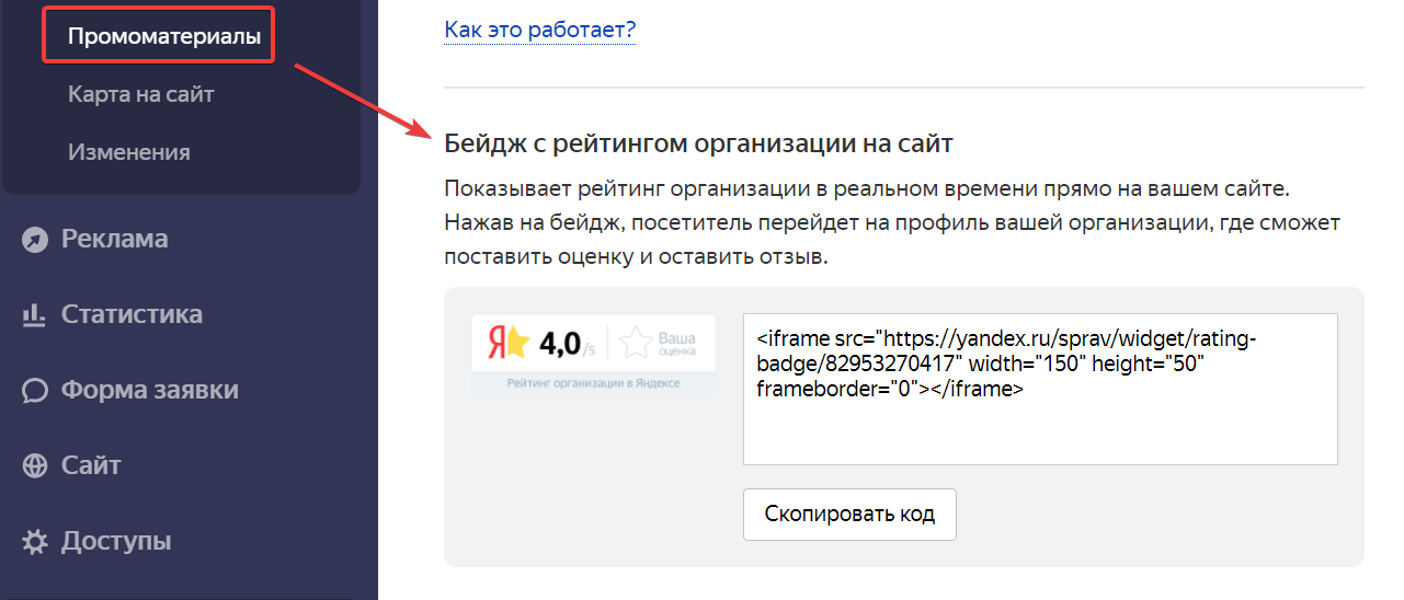 Получите код. В разделе О компании → Промоматериалы перейдите к блоку с бейджем и нажмите Скопировать код.