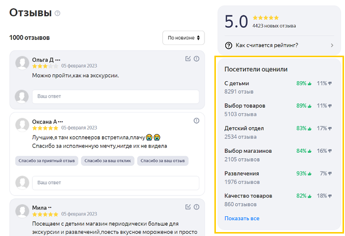 По умолчанию отзывы отображаются от новых к старым. В блоке Посетители оценили можно фильтровать и сортировать отзывы: