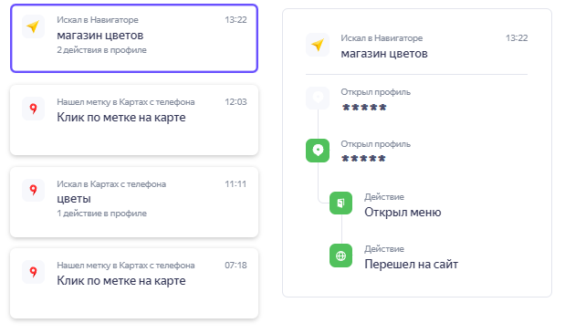 Действия с любым блоком или кнопкой в профиле фиксируются. Например, пользователь построил маршрут или посмотрел фото. Оставил ли пользователь оценку или отзыв — не отслеживается.