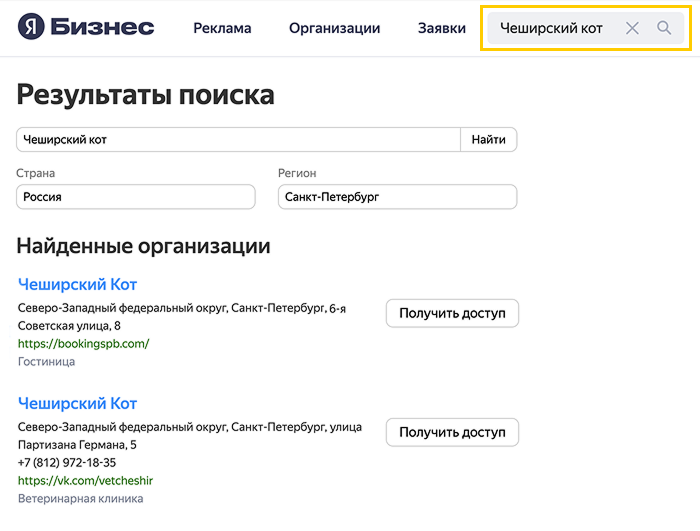 В результатах поиска найдите свою компанию и нажмите Получить доступ.