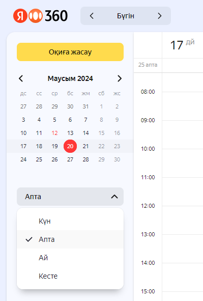 Әдепкі түрде экранда ағымдағы аптаға арналған күнтізбе көрсетіледі. Бір күн, бір ай үшін немесе Кесте режимінде оқиғаларды көрсету үшін сол жақтағы панельдегі аспа тізімнен көрінісін таңдаңыз: