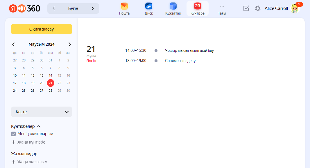 - Күнтізбенің мазмұнын түзету — сіз бүкіл оқиғаларды қарай, жасай және түзете аласыз.