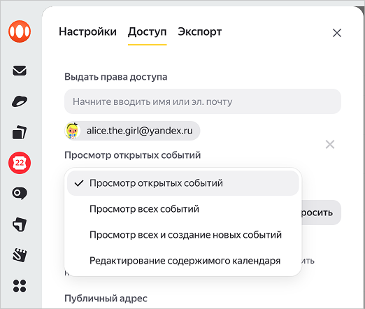 На вкладке Доступ в поле Выдать права доступа начните вводить имя или адрес приглашаемого — Календарь предложит подсказки с подходящими контактами.