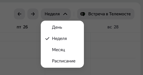 Выберите вид Яндекс Календаря в выпадающем списке на панели слева: