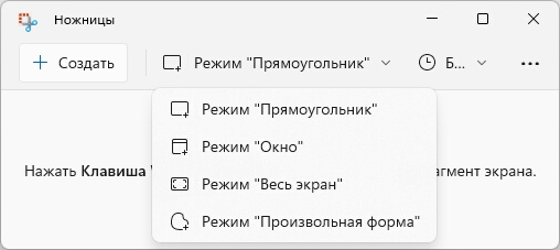 Выберите режим: прямоугольная или произвольная форма, нажмите кнопку Создать и сделайте снимок отдельного окна или всего экрана.