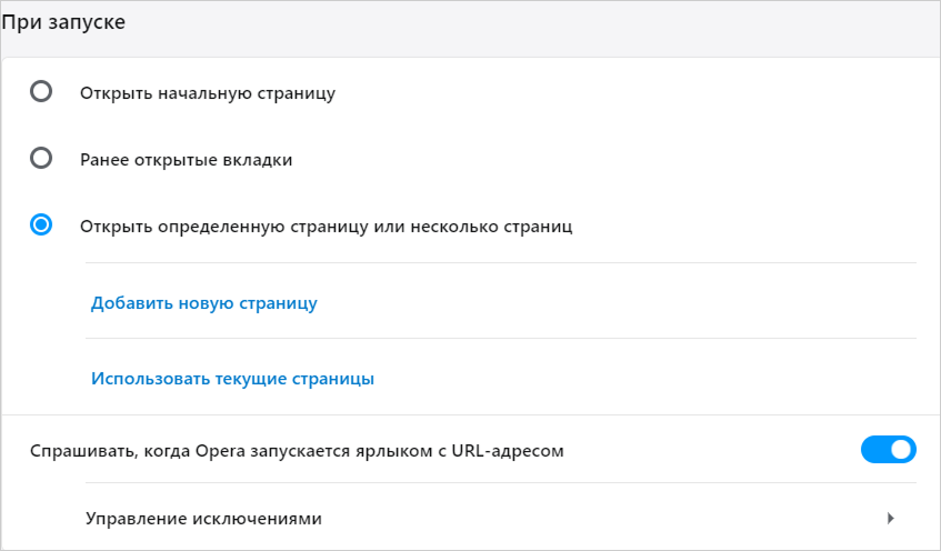 - В блоке При запуске выберите пункт Открыть определенную страницу или несколько страниц → Добавить новую страницу.