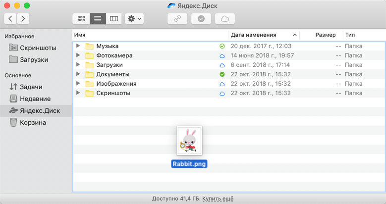 Finder-дегі Диск қалтасын ашыңыз және оған қажетті файлдарды көшіріңіз. Осылай жүктеген кезде файл компьютердегі Яндекс Диск қалтасында да, бұлтты Яндекс Дискіде де сақталады.