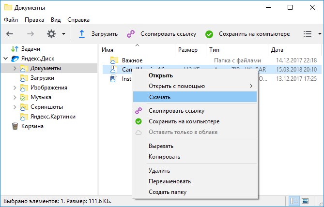 Файлдың немесе қалтаның контекст мәзірінен Жүктеп алу батырмасын басыңыз.